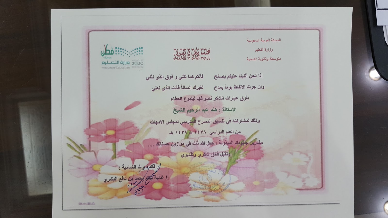 متوسطة و ثانوية الشامية مجلس الأمهات الخميس 13 2 1439هـ